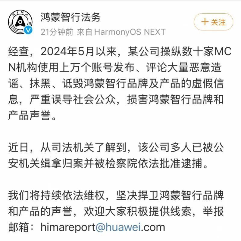 3月4日,鸿蒙智行法务发布首条微博,称某公司操纵水军抹黑鸿蒙智行,多人已被缉拿归案。鸿蒙智行法务表示,经查,2024年5月以来,某公司操纵数十家MCN机构使用上万个账号发布、评论大量恶意造谣、抹黑、诋毁鸿蒙智行品牌及产品的虚假信息,严重误导社会公众,损害鸿蒙智行品牌和产品声誉。